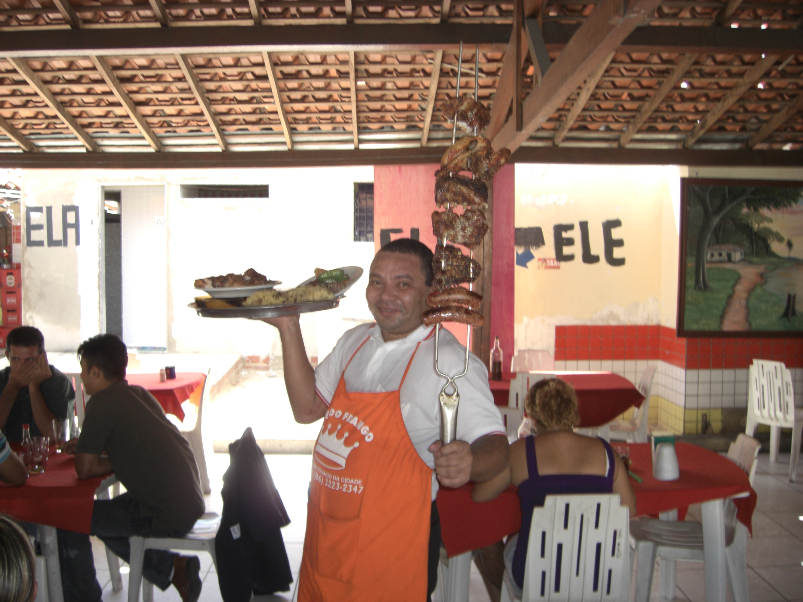 Unbedingt sollte man (als Fleischesser) ein „Rodizio de Carne“ in einer „Churrasceria“ probieren: Für einen Pauschalpreis kommen die Kellner mit verschiedenen Fleischsorten und Würsten sozusagen bis zum Abwinken vorbei, und es gibt ein - meistens - sehr umfangreiches Beilagenbuffet. Auf dem Tisch liegt ein Deckel oder ein Holzstück, das auf der einen Seite rot und auf der anderen Seite grün ist. Solange die grüne Seite oben ist, kommen die Kellner mit dem Fleisch an den Tisch.